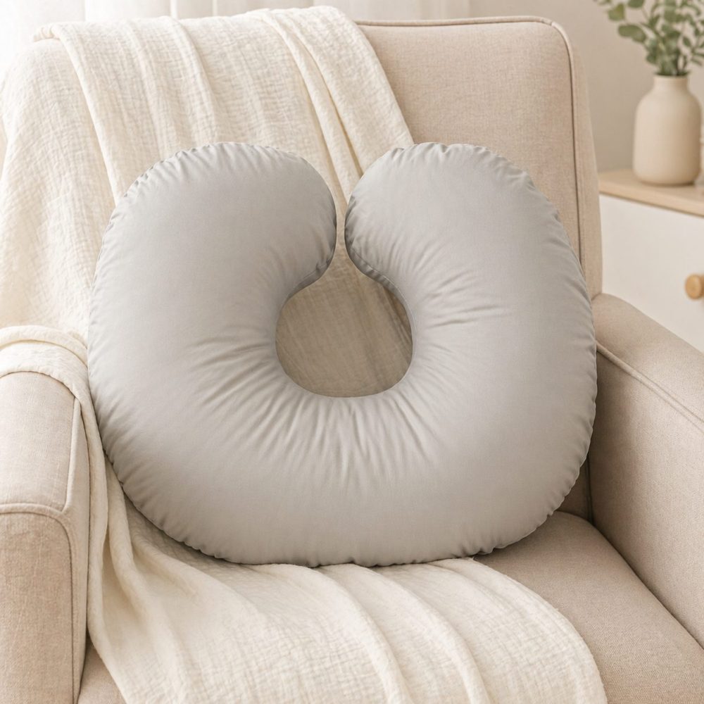 Seu formato funcional permite diversas utilizações: apoio para amamentação, ninho para descanso, auxílio para aprender a sentar e suporte para treinar o engatinhar, acompanhando o crescimento do bebê com conforto e segurança.