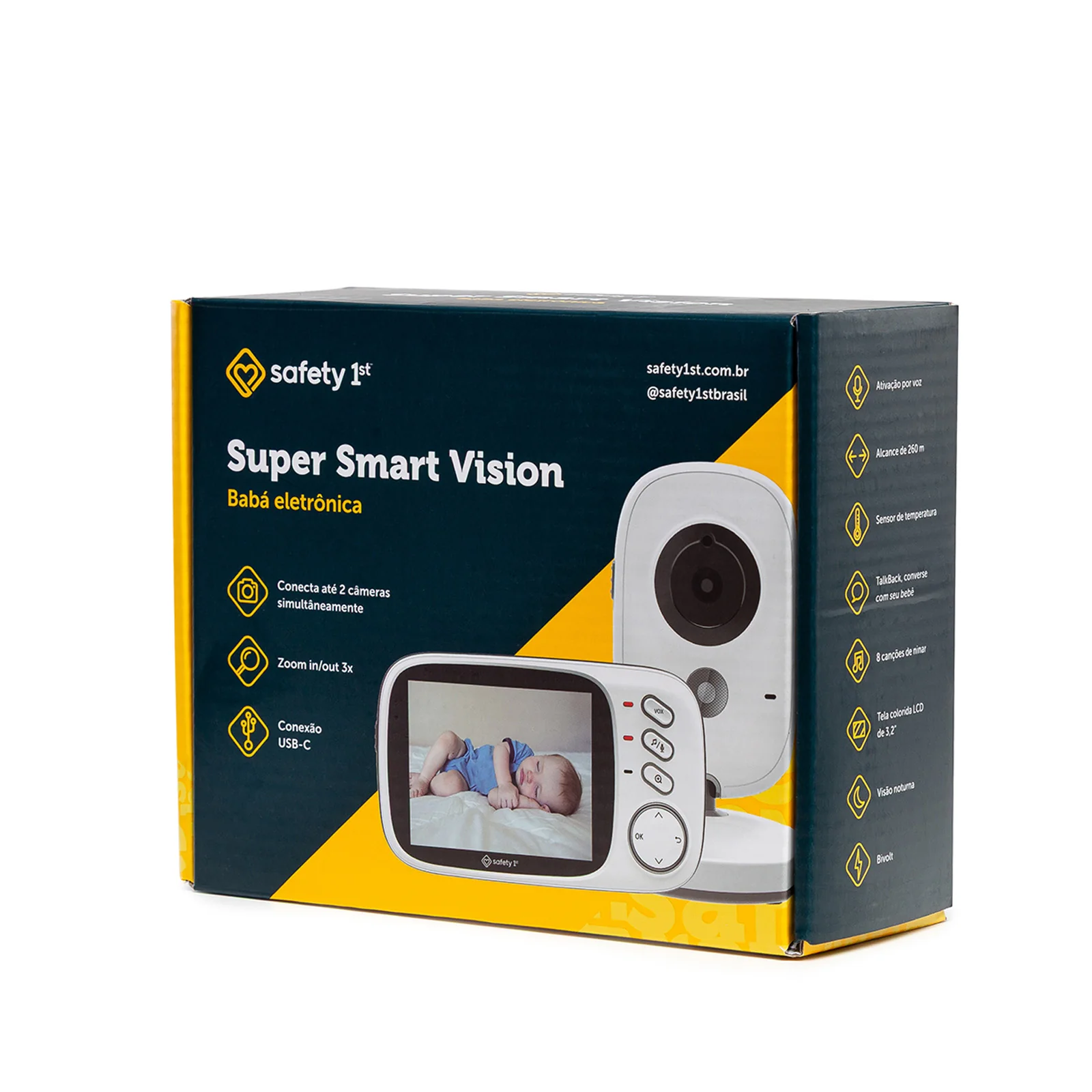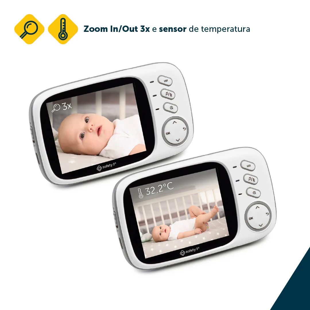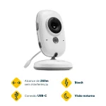 Ela possui tela colorida de 3,2”, com imagem clara e nítida, permitindo acompanhar o bebê a qualquer momento. A visão noturna automática garante segurança mesmo no escuro, e o alcance de até 260 metros permite monitorar outros cômodos da casa sem perder o sinal.