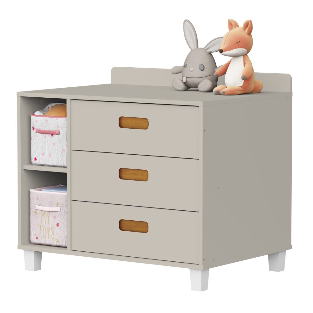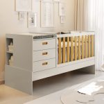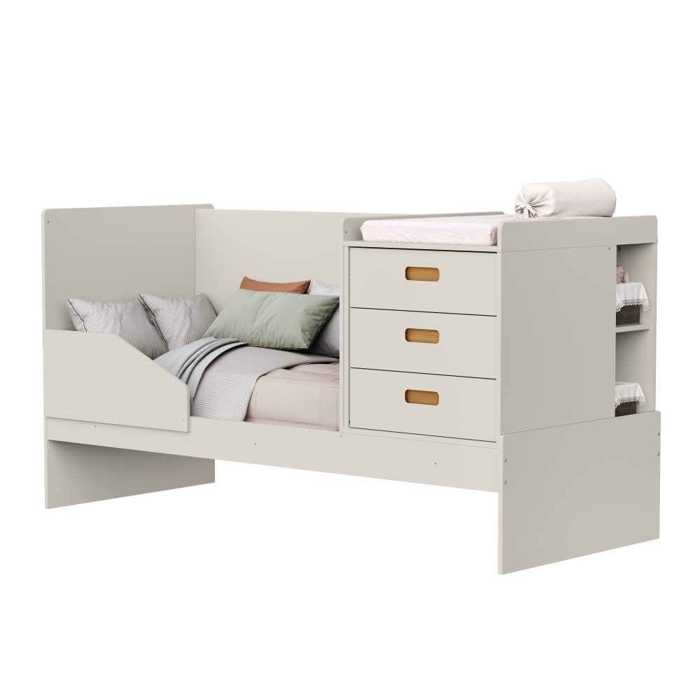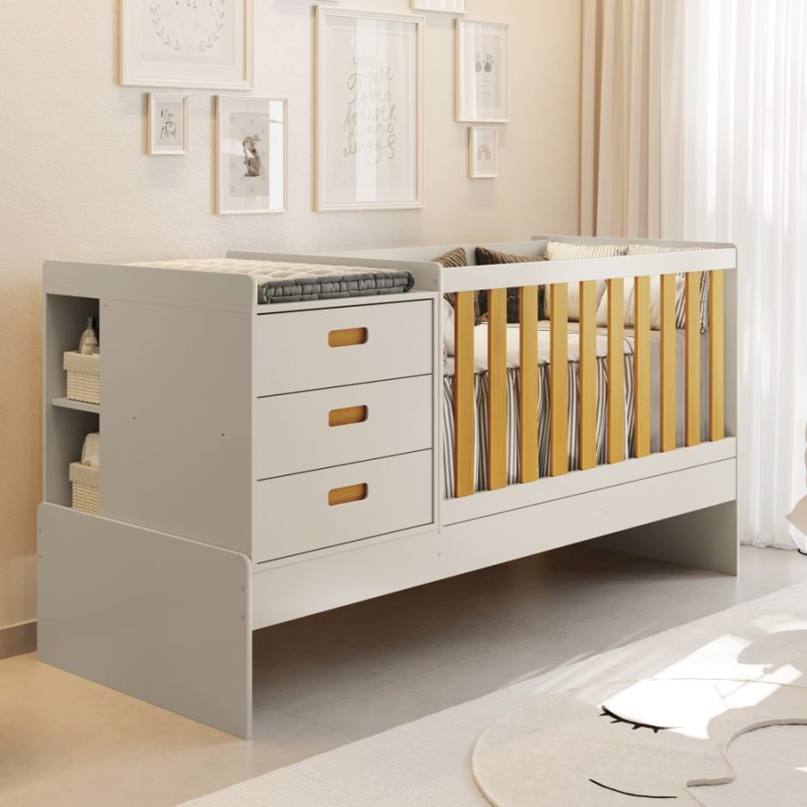 Seu grande diferencial é a versatilidade: o berço se transforma em mini cama, cama de solteiro, cômoda e escrivaninha, acompanhando o crescimento da criança. A cômoda acoplada conta com gavetas com corrediças telescópicas, puxadores embutidos e tampo superior que pode ser usado como trocador, facilitando a rotina do dia a dia.
