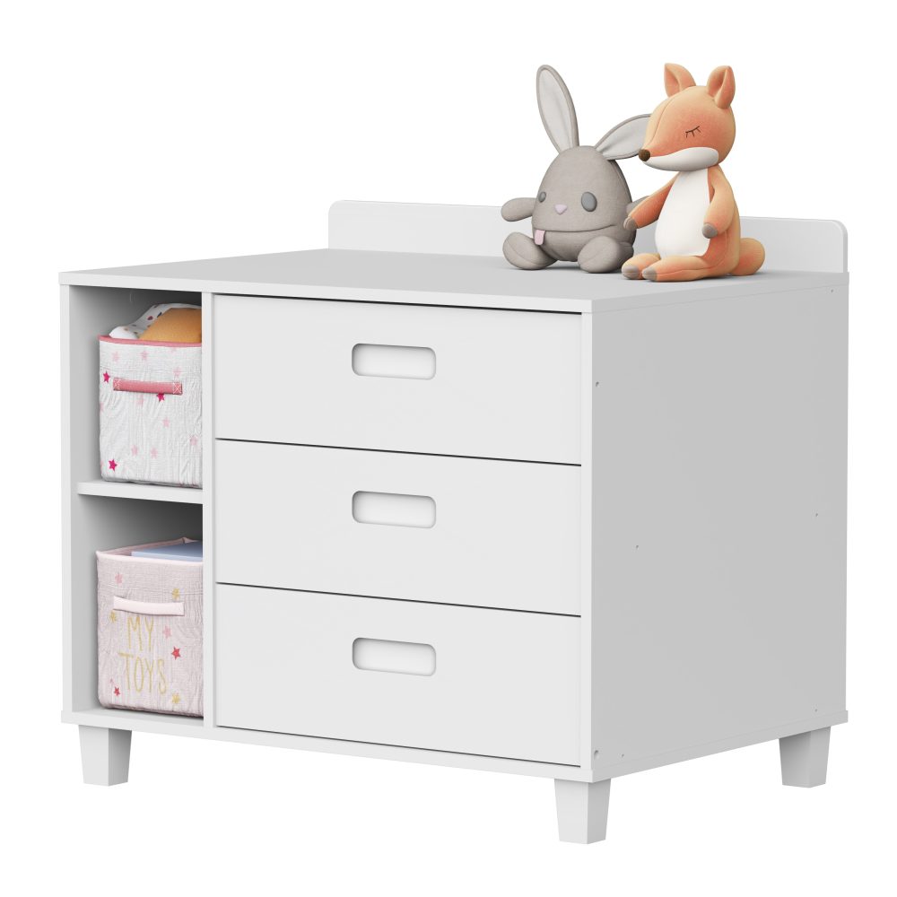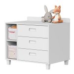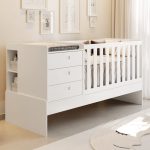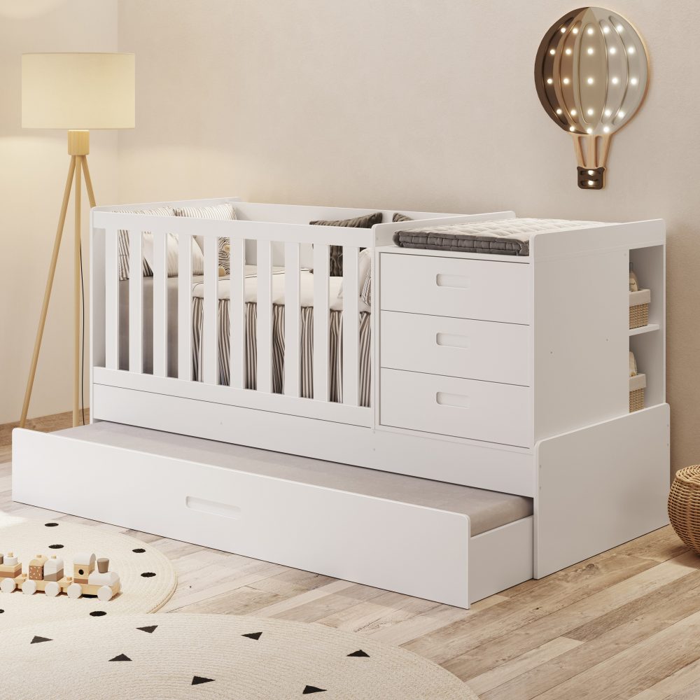 Seu grande diferencial é a versatilidade: o berço se transforma em mini cama, cama de solteiro, cômoda e escrivaninha, acompanhando o crescimento da criança. A cômoda acoplada conta com gavetas com corrediças telescópicas, puxadores embutidos e tampo superior que pode ser usado como trocador, facilitando a rotina do dia a dia.
