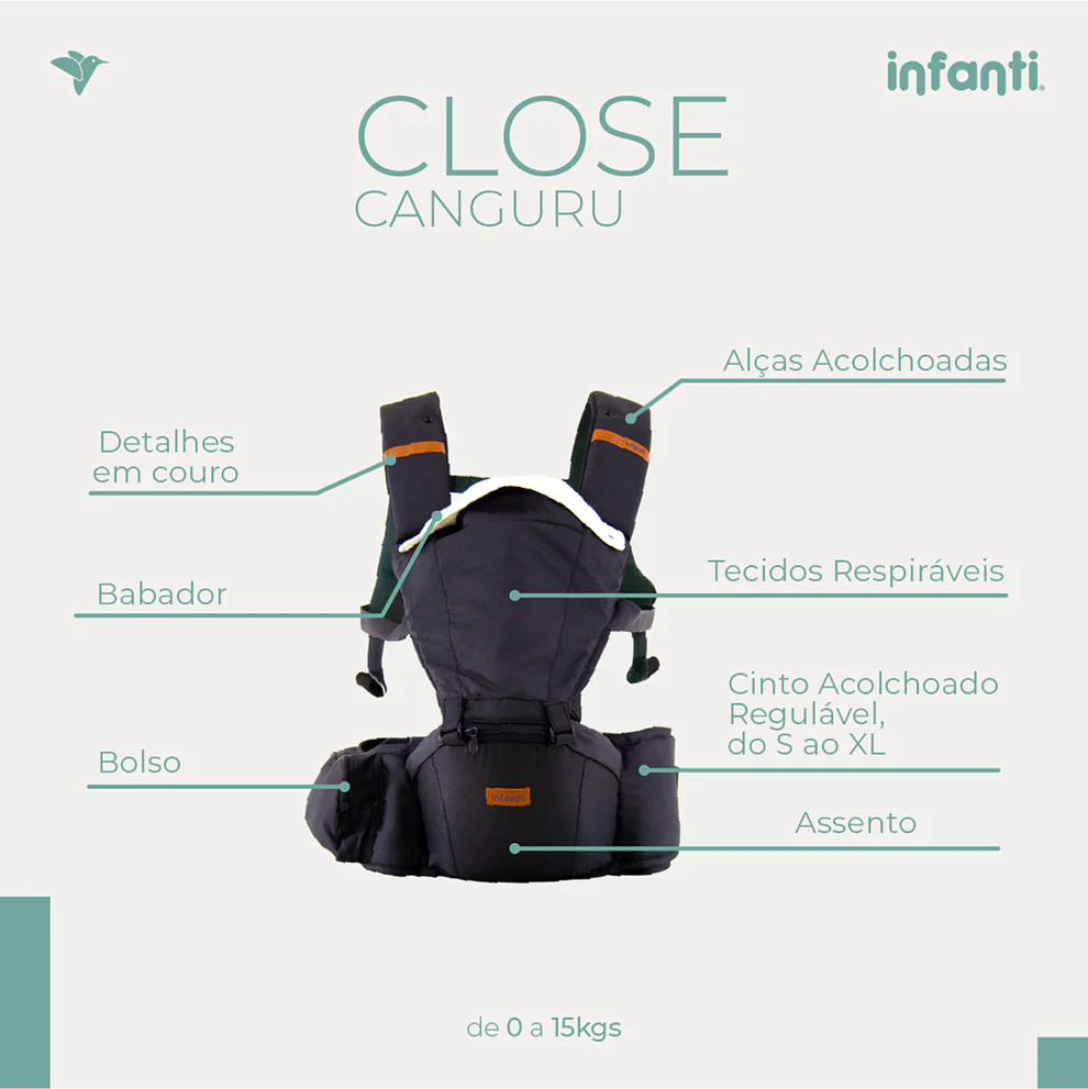 O Canguru Close 5 em 1 da Infanti, é a solução completa para manter o bebê sempre perto, com conforto, segurança e praticidade no dia a dia. Versátil, acompanha o crescimento da criança desde o nascimento até 15 kg, oferecendo 5 modos de uso, incluindo apoio para recém-nascido, bebê voltado para os pais ou para a paisagem, uso como banquinho e opção nas costas.