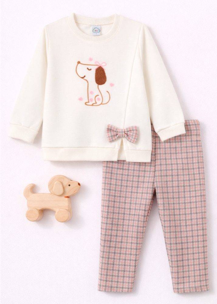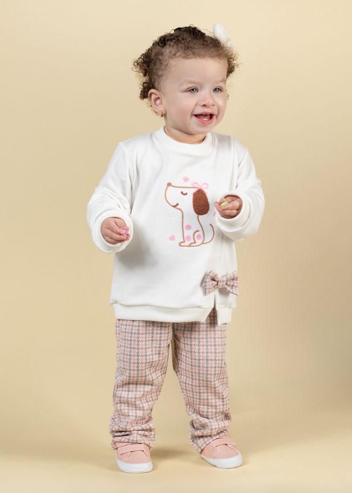O blusão é confeccionado em tecido macio e confortável, ideal para o dia a dia. Possui gola redonda e punhos ajustados, garantindo melhor caimento. O destaque fica por conta da estampa de cachorrinha com detalhes em relevo, além do lacinho aplicado na parte frontal, que traz um toque charmoso e sofisticado à peça.