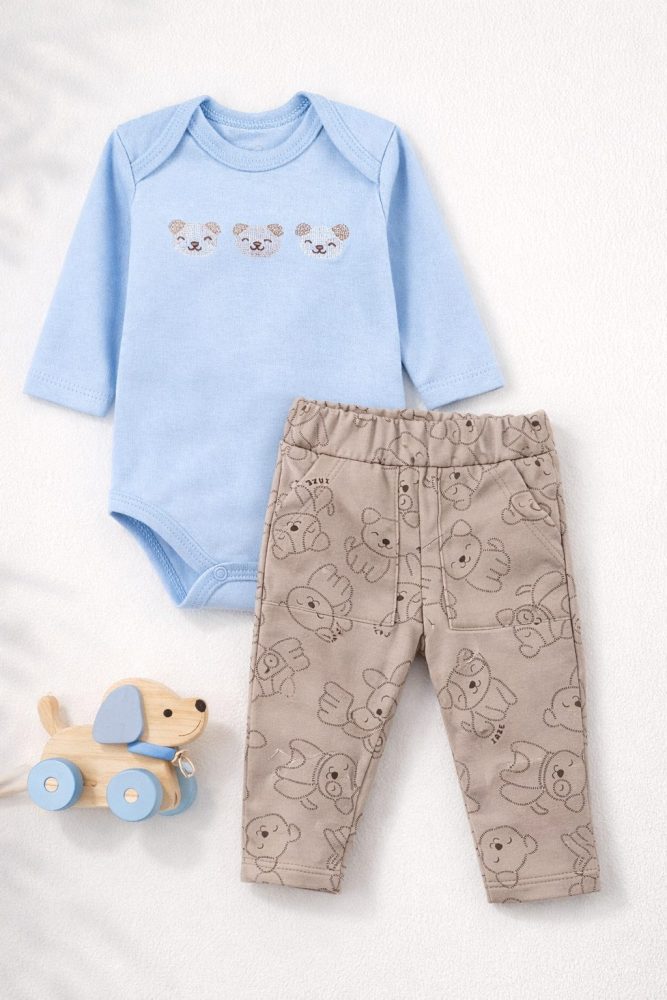 Conjunto Bebê Body Azul Bordado Cachorrinhos Com Calça Bege