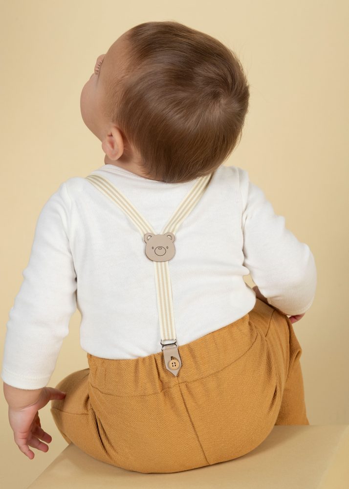 A calça em tom caramelo complementa o conjunto com muito estilo. Conta com elástico na cintura, proporcionando ajuste confortável sem apertar, e acompanha suspensórios ajustáveis, que dão um toque sofisticado e diferenciado ao look.