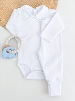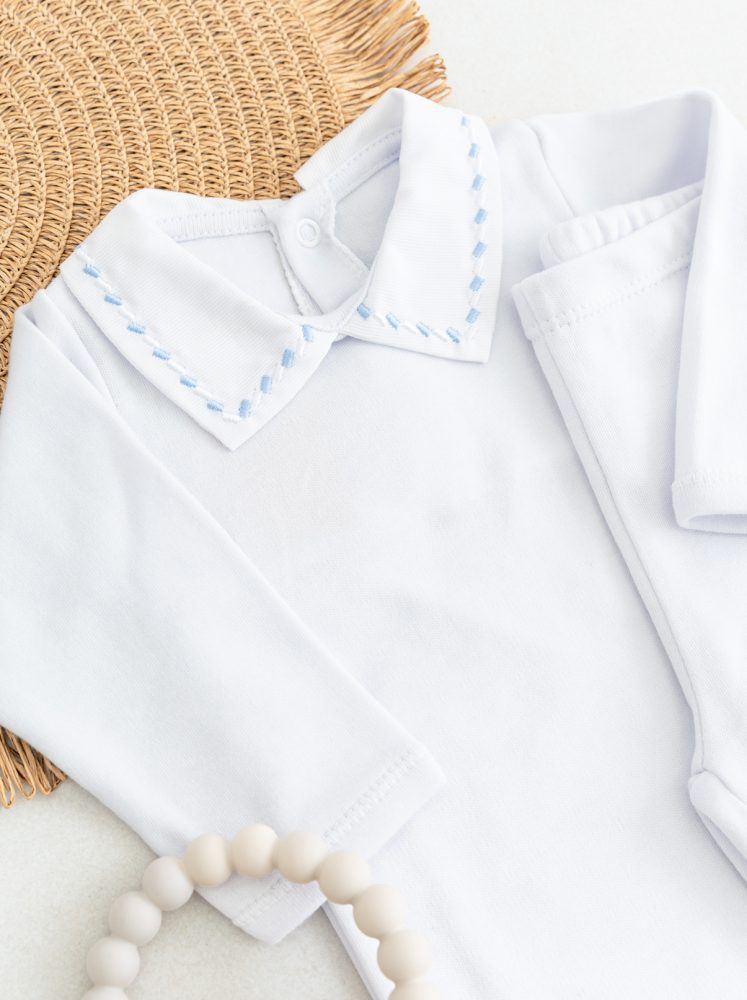 O body possui gola clássica com bordado azul em losango, trazendo um charme atemporal e sofisticado. A abertura entrepernas facilita a troca de fraldas, enquanto a calça com cós e vira pé na barra que pode ser dobrada para cobrir o pezinho. Ideal para ocasiões especiais ou para um visual refinado no dia a dia.