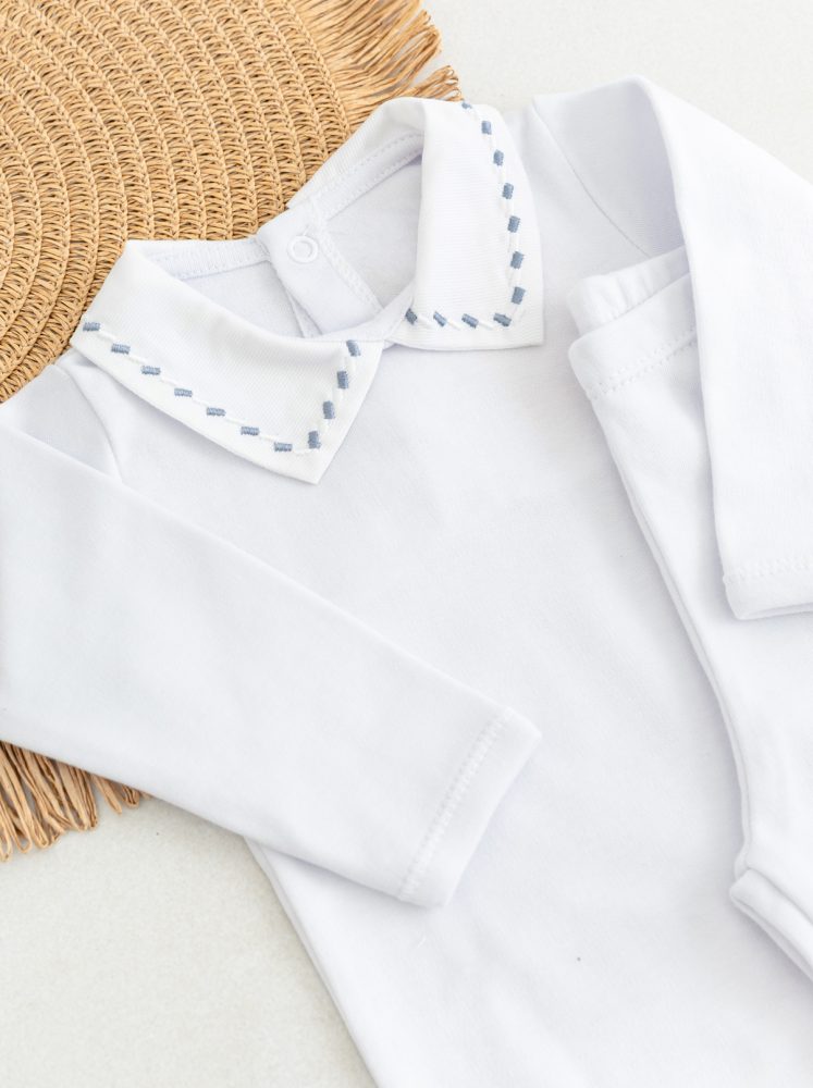 O body possui gola clássica com bordado azul em losango, trazendo um charme atemporal e sofisticado. A abertura entrepernas facilita a troca de fraldas, enquanto a calça com cós e vira pé na barra que pode ser dobrada para cobrir o pezinho. Ideal para ocasiões especiais ou para um visual refinado no dia a dia.