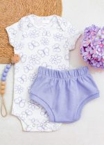 Acompanha um tapa fralda em malha algodão, na cor lilás, com cós elástico confortável que não aperta e se ajusta perfeitamente ao corpo do bebê. Um conjunto leve, estiloso e perfeito para brincar, passear ou ficar em casa com conforto.
