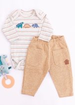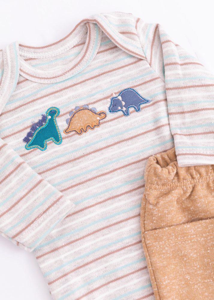 O Conjunto Iaze traz conforto e estilo para o dia a dia do bebê. O body em tom mesclado possui listras coloridas e um bordado super delicado de dinossauros, deixando a peça divertida e moderna. Confeccionado em malha macia e respirável, ele conta com gola envelope para facilitar na hora de vestir e fechamento entrepernas, tornando as trocas práticas e rápidas.