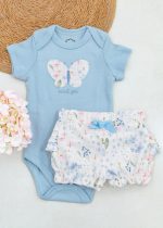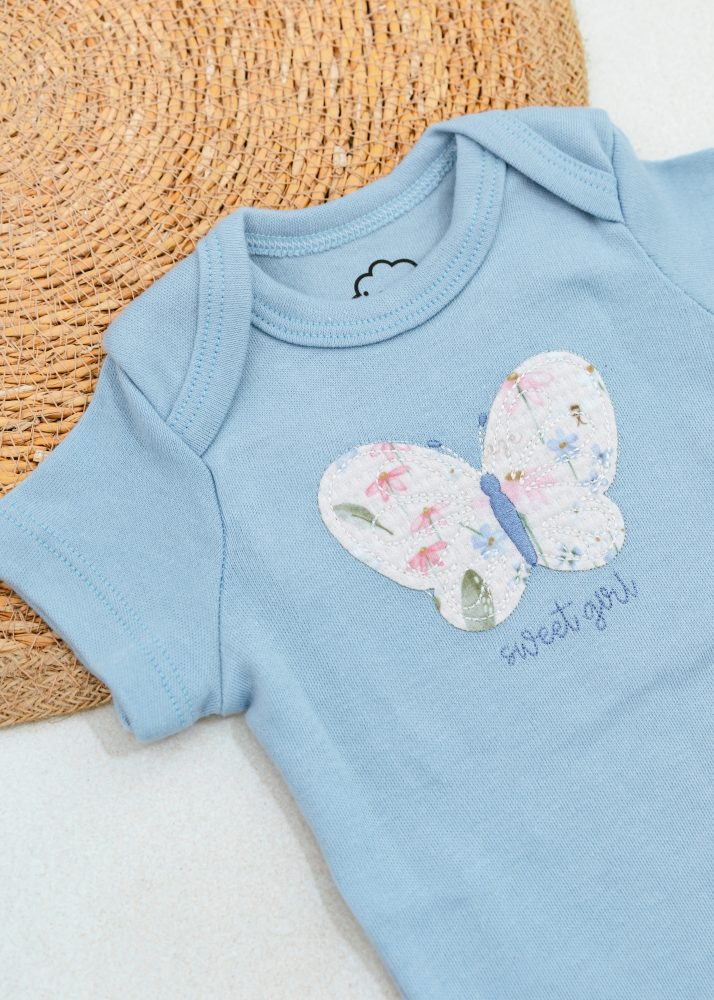 O conjunto body borboleta com tapa fralda floral é aquele look delicado e super confortável para a bebê aproveitar o dia com muito estilo. O body azul é confeccionado em malha macia e possui bordado aplicado de borboleta com flores em tons suaves, deixando a peça ainda mais fofa. A gola envelope facilita vestir e os botões de pressão no entrepernas deixam a troca muito mais prática.