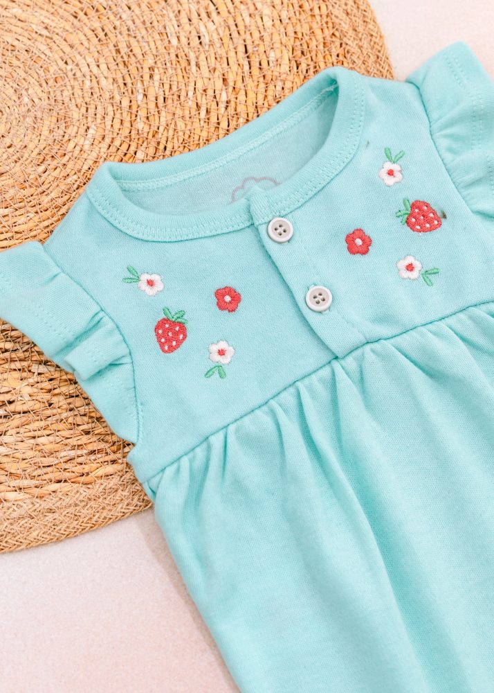 O conjunto body + shorts moranguinho é a peça ideal para deixar a bebê confortável, estilosa e super fofinha. O body em tom verde água é confeccionado em malha macia e possui bordados delicados de morango e flores, além de manguinhas com babadinhos e dois botõezinhos frontais que dão um charme especial.