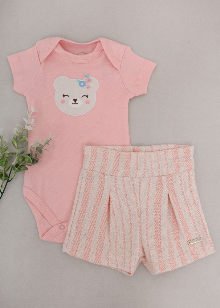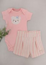 Conjunto Body Bordado Urso e Shorts Listrado Rosa Bebê