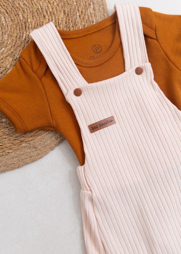 A jardineira em ribana canelada premium, com modelagem confortável e detalhe frontal charmoso, traz um visual moderno e delicado. Conta com botões nos ombros e fechamento por botões de pressão entre as pernas, tornando o vestir ainda mais fácil. Acompanha body caramelo em malha macia, gola envelope e botões de pressão no entrepernas, facilitando a troca.