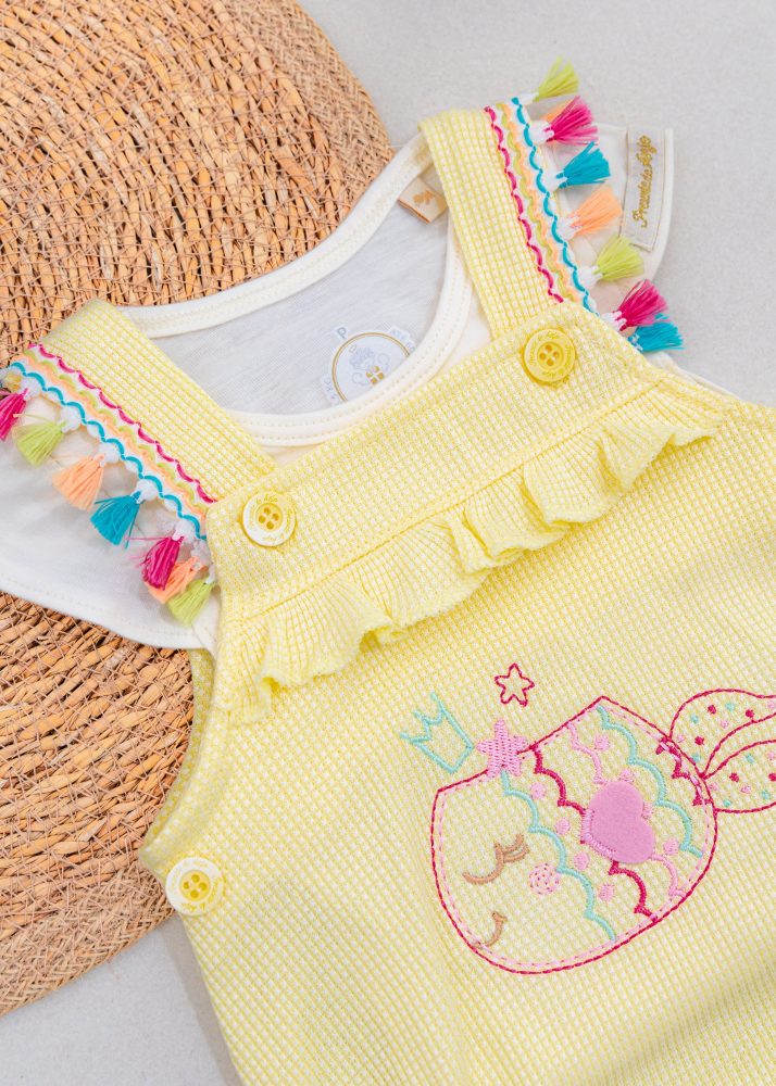 O conjunto romper amarelo é a escolha perfeita para um look alegre, delicado e super confortável para a bebê. Confeccionada em tecido texturizado leve, ela possui bordado no desenho de peixe, cheio de detalhes encantadores. As alças decoradas com tassels coloridos e o babadinho frontal deixam a peça ainda mais fofa e divertida.