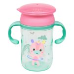 O copo de treinamento 360° com alça pode ser bebido em toda sua borda e possui válvula com tecnologia que permite a vedação automática nas bordas logo após beber. é perfeito para auxiliar no desenvolvimento das crianças e acompanhar a transição da mamadeira para o copo. Possui formato e alças anatômicas, para os pequenos encaixarem perfeitamente a mãozinha. Comporta até 270 ml. é livre de bpa e ftalatos, 100% atóxico e recomendado para bebês maiores de 6 meses. Recomendações: lave antes do primeiro uso com água corrente e sabão neutro. Pode ser fervido, vai à lava-louças (somente na prateleira superior), ao micro-ondas e ao freezer.