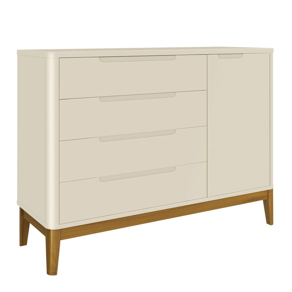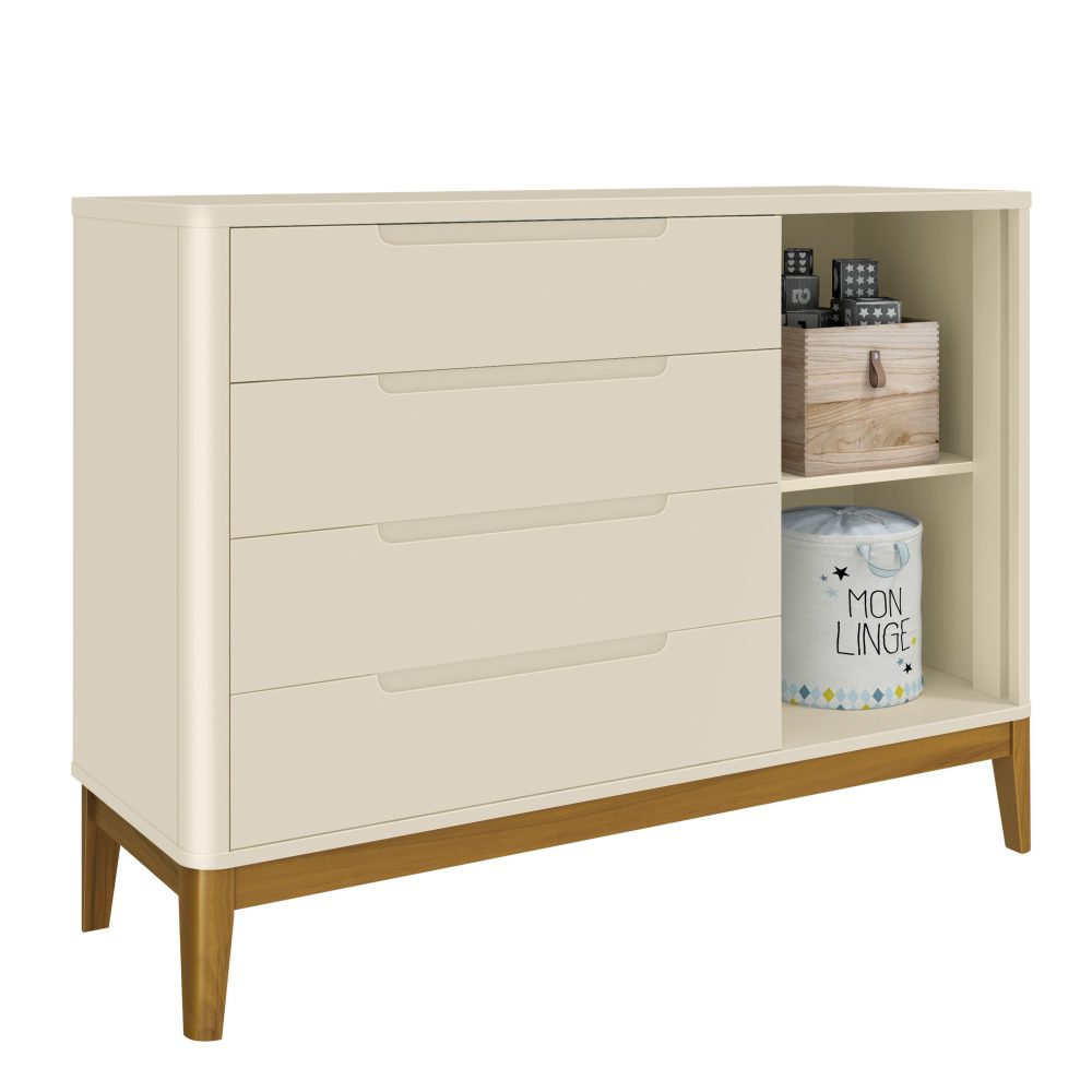 A Cômoda Sapateira Boom oferece praticidade e organização no dia a dia. Possui 4 gavetas espaçosas com corrediças telescópicas, garantindo abertura suave e silenciosa e uma sapateira lateral, além de puxadores embutidos que valorizam o visual clean. Seus cantos arredondados garantem mais proteção, enquanto os pés em madeira pinus complementam o visual aconchegante. O sistema anti-tombamento traz ainda mais tranquilidade, aumentando a segurança no quarto do bebê.
