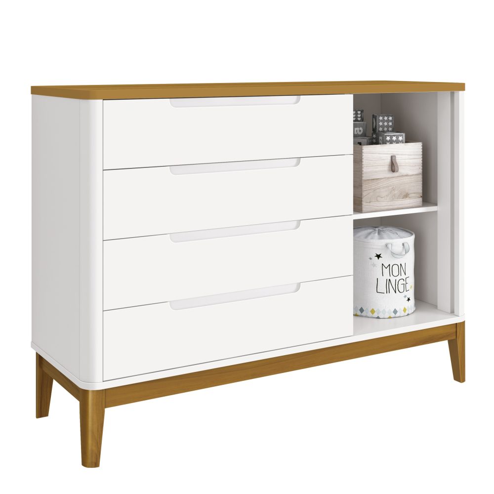A Cômoda Sapateira Boom oferece praticidade e organização no dia a dia. Possui 4 gavetas espaçosas com corrediças telescópicas, garantindo abertura suave e silenciosa, acompanha organizador com divisórias, facilitando a organização dos itens do bebê e uma sapateira lateral. Seus cantos arredondados garantem mais proteção, enquanto os pés em madeira pinus complementam o visual aconchegante. O sistema anti-tombamento traz ainda mais tranquilidade, aumentando a segurança no quarto do bebê.