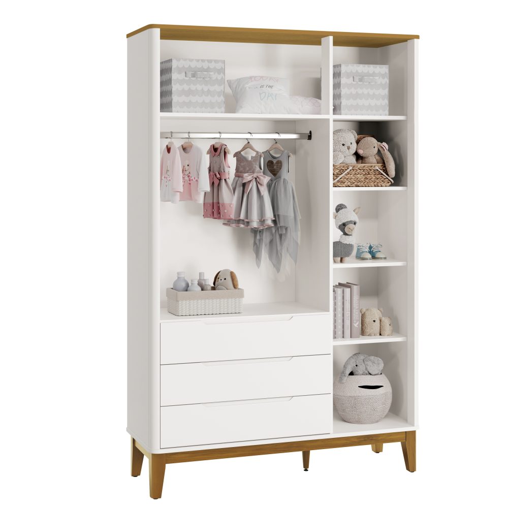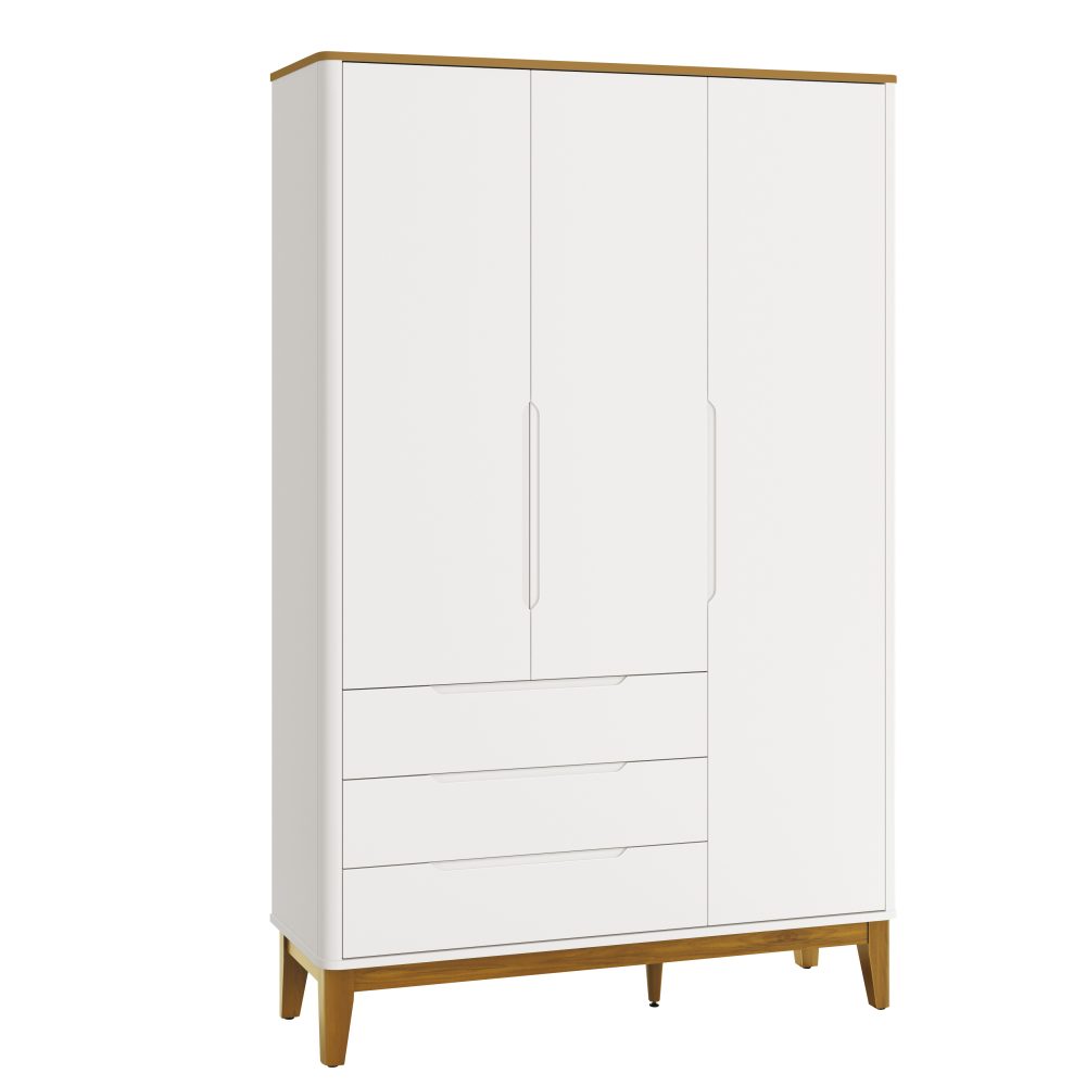 O Roupeiro Boom 3 Portas é fabricado em 100% MDF, garantindo resistência e excelente acabamento. Possui 3 portas com puxadores embutidos, cantos arredondados e acabamento sem parafusos aparentes, proporcionando mais segurança e um visual clean. Conta com cabideiro metálico para melhor organização das roupas, 3 gavetas com corrediças telescópicas que permitem abertura suave e total, e pés em madeira pinus, que adicionam charme e estabilidade ao móvel.
