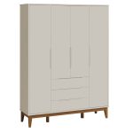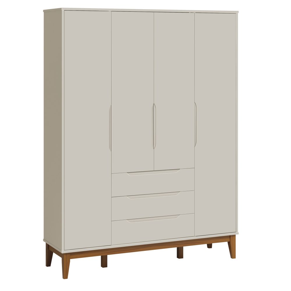O Roupeiro Elfe 4 Portas é fabricado em 100% MDF, garantindo resistência e excelente acabamento. Possui 4 portas com puxadores embutidos, cabideiro metálico para melhor organização das roupas, 3 gavetas com corrediças telescópicas que permitem abertura suave e total e os pés em madeira pinus, que adicionam charme e estabilidade ao móvel.