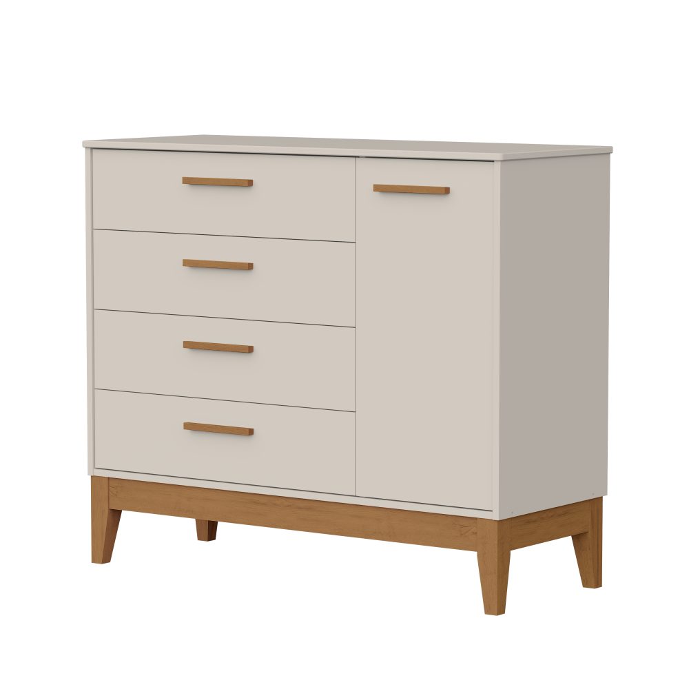 Cômoda Sapateira Flip é produzida em 100% MDF, oferecendo resistência e durabilidade. Possui 4 gavetas amplas com corrediças telescópicas, 1 porta com prateleira móvel interna, adaptável à sua necessidade, além de puxadores robustos em MDF revestido, pés em madeira e sistema anti-tombamento, garantindo mais segurança para o ambiente infantil.