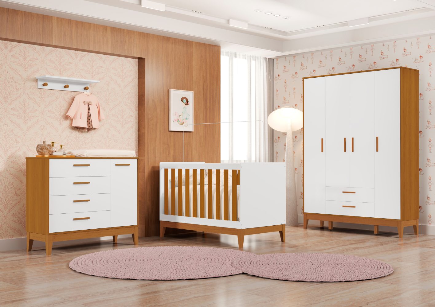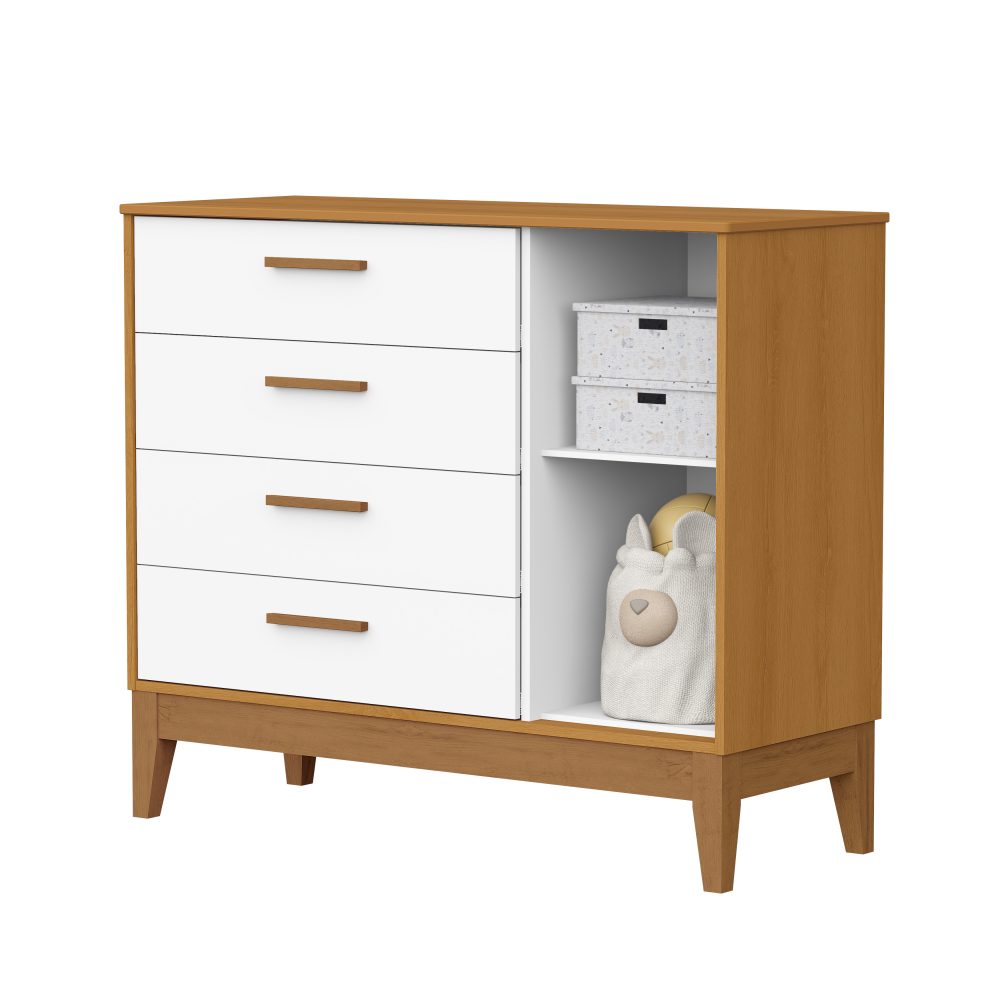 Cômoda Sapateira Flip é produzida em 100% MDF, oferecendo resistência e durabilidade. Possui 4 gavetas amplas com corrediças telescópicas, 1 porta com prateleira móvel interna, adaptável à sua necessidade, além de puxadores robustos em MDF revestido, pés em madeira e sistema anti-tombamento, garantindo mais segurança para o ambiente infantil.