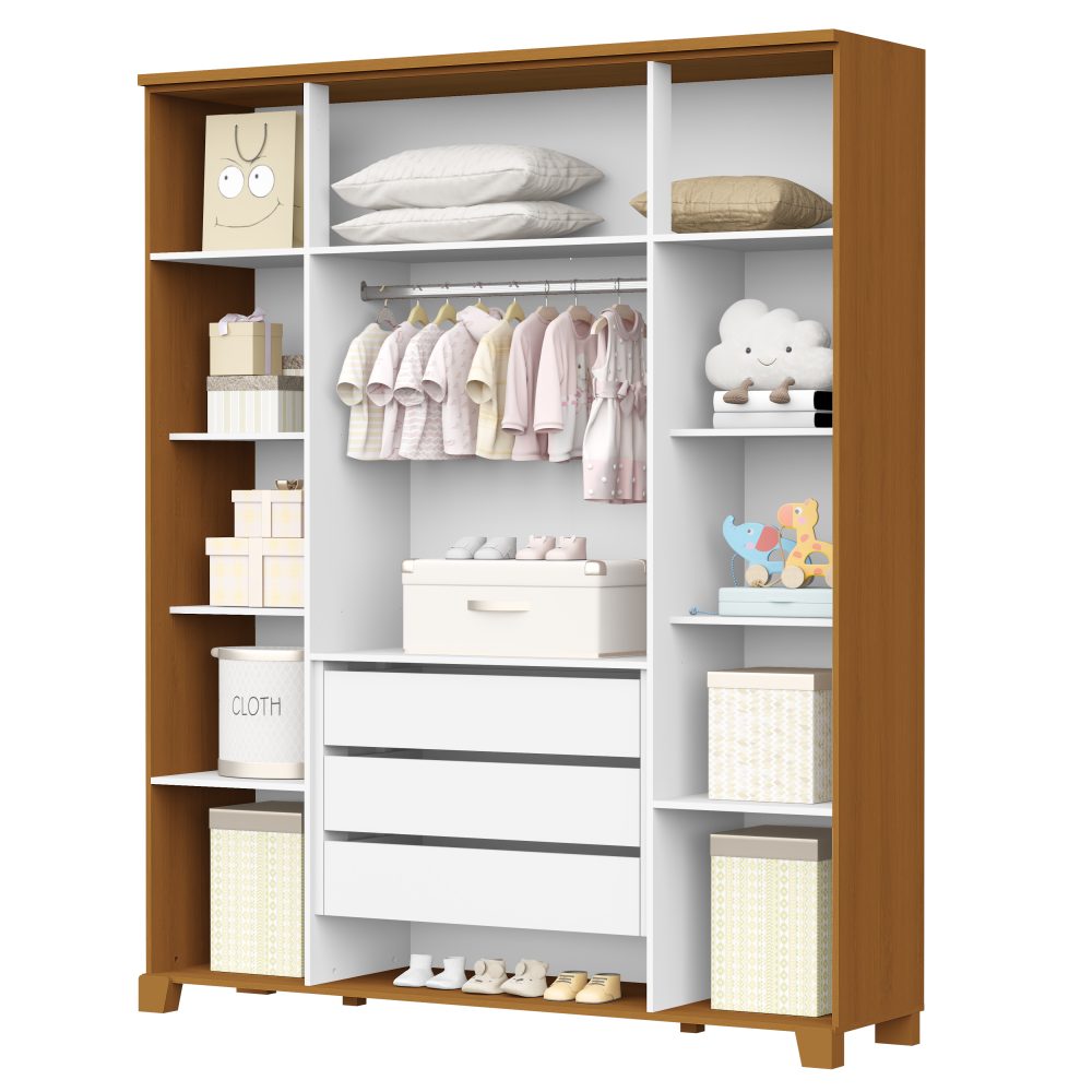 O Roupeiro Luna Max é fabricado em 100% MDF, garantindo resistência e excelente acabamento. Possui 4 portas com puxadores embutidos. Conta com cabideiro metálico para melhor organização das roupas, 3 gavetas com corrediças telescópicas que permitem abertura suave e total, e pés em madeira pinus, que adicionam charme e estabilidade ao móvel.