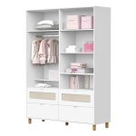 O Roupeiro Ollie 4 Portas é fabricado em 100% MDF, garantindo resistência e excelente acabamento. Possui 4 portas com puxadores embutidos e dobradiças com sistema Slow Motion. Conta com cabideiro metálico para melhor organização das roupas, 4 gavetas com corrediças telescópicas que permitem abertura suave e total, detalhe em tela tipo rattan natural, aplicado na parte frontal, que proporciona ventilação e um toque artesanal ao móvel e os pés em madeira pinus, que adicionam charme e estabilidade ao móvel.
