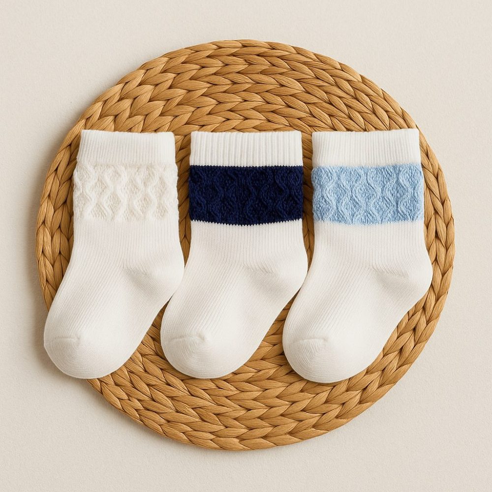 Ideais para o dia a dia, mantêm os pezinhos quentinhos sem apertar, garantindo conforto, flexibilidade e liberdade de movimento. O kit contém três pares em tons suaves de azul e branco — perfeitos para compor os looks do bebê com muito estilo.