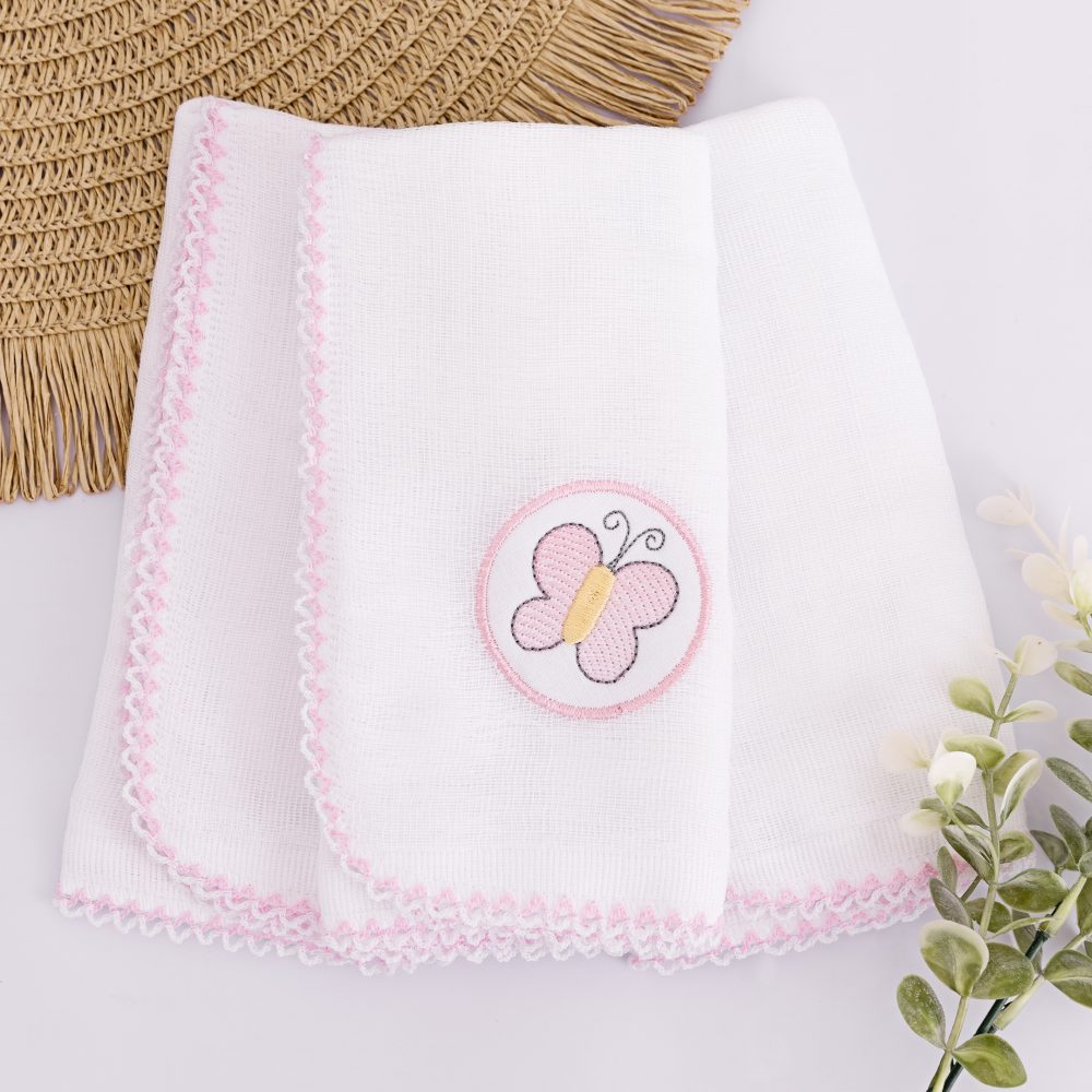 O acabamento artesanal em crochê rosa e o bordado de borboleta delicada tornam cada fraldinha única e encantadora.