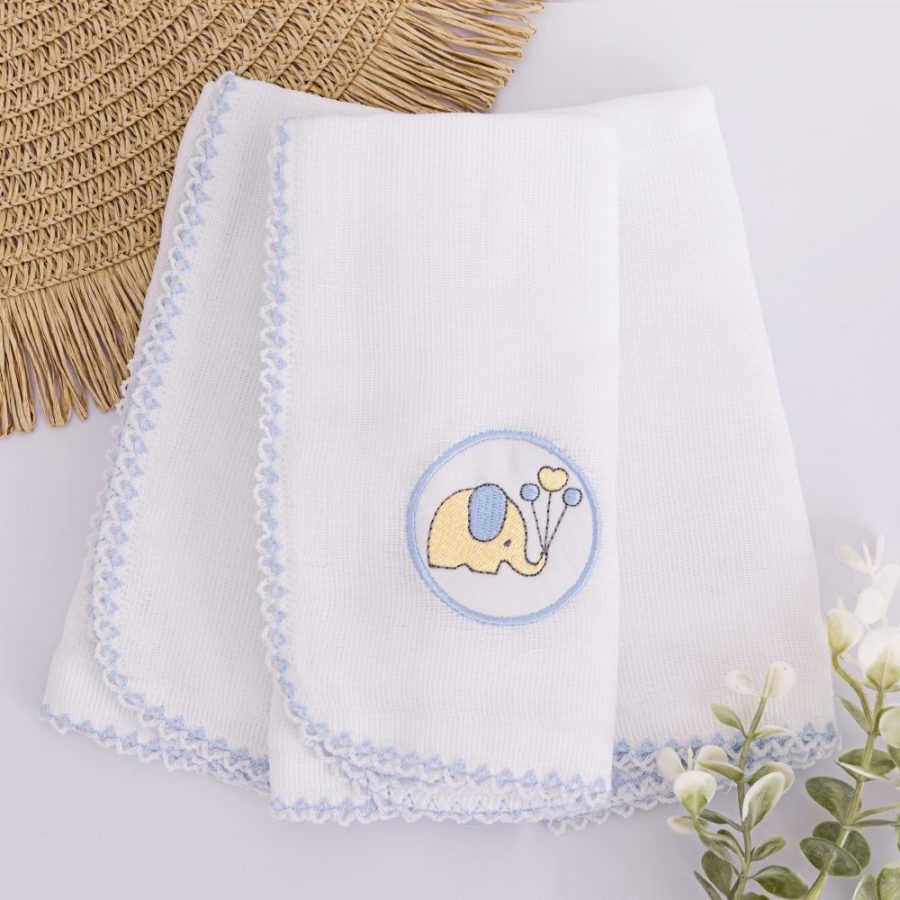 O acabamento artesanal em crochê azul bebê e o bordado de elefantinho delicado tornam cada fraldinha única e encantadora.