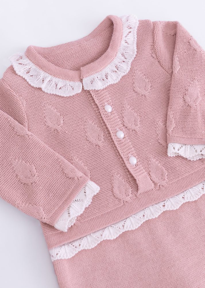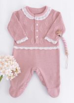 Seja o primeiro a avaliar “Macacão Bebê em Tricô Rose com Gola Rendada e Pezinho”