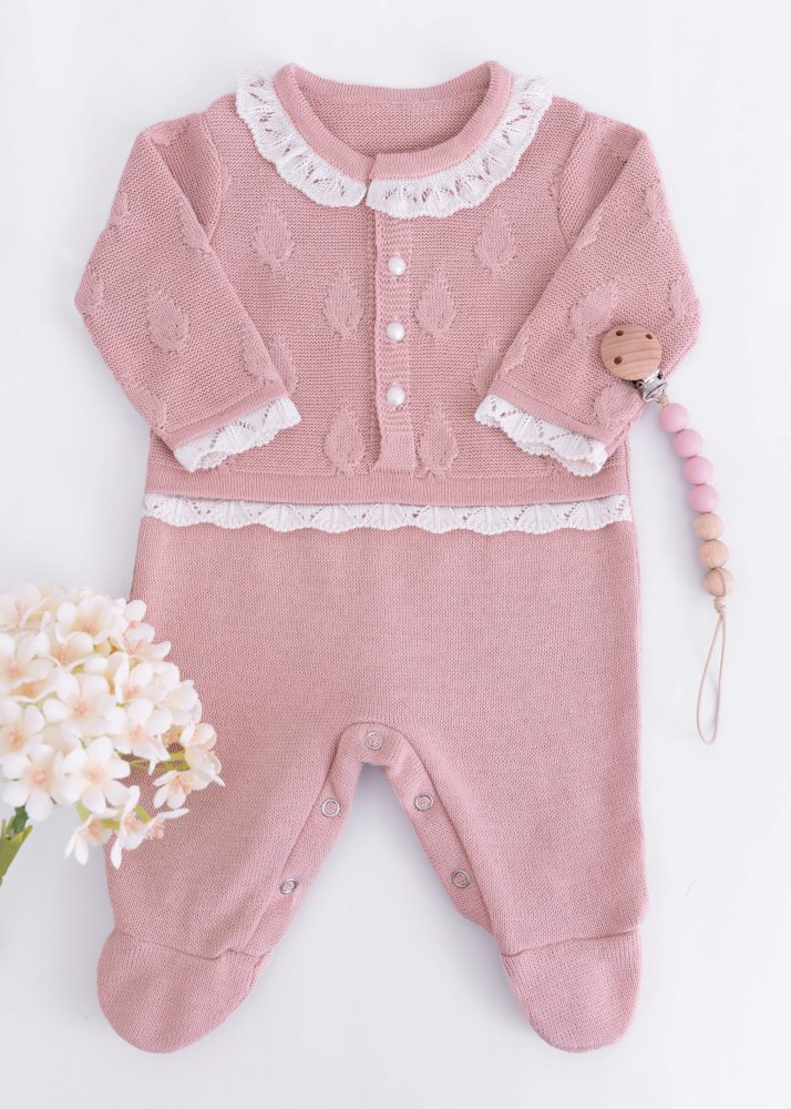 Macacão Bebê em Tricô Rose com Gola Rendada e Pezinho
