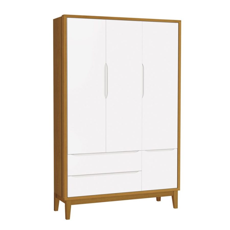 O Roupeiro Classic 3 Portas é fabricado em 100% MDF, garantindo resistência e excelente acabamento. Possui 3 portas com puxadores embutidos, cabideiro metálico para melhor organização das roupas, 2 gavetas com corrediças telescópicas que permitem abertura suave e total e pés em madeira pinus, que adicionam charme e estabilidade ao móvel.