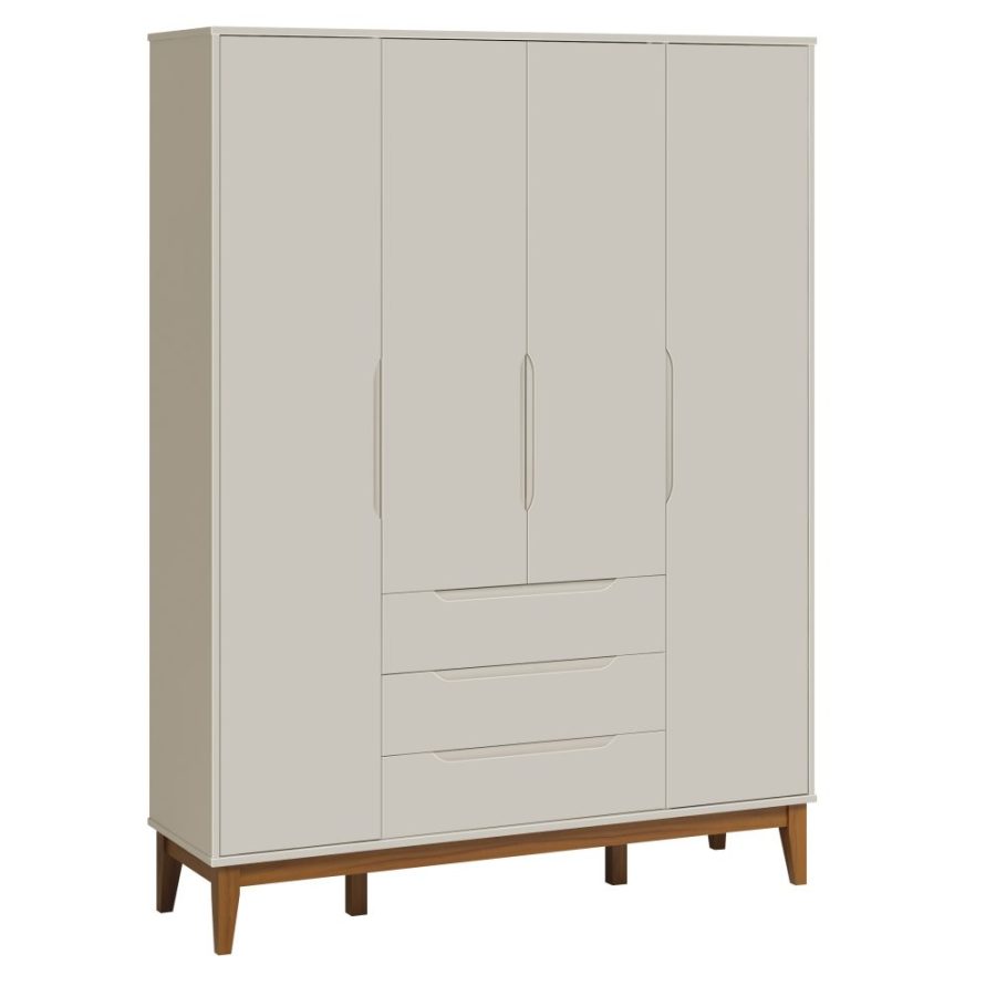 O Roupeiro Elfe 4 Portas é fabricado em 100% MDF, garantindo resistência e excelente acabamento. Possui 4 portas com puxadores embutidos, cabideiro metálico para melhor organização das roupas, 3 gavetas com corrediças telescópicas que permitem abertura suave e total, e os pés em madeira pinus, que adicionam charme e estabilidade ao móvel.