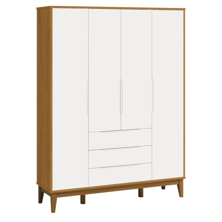 O Roupeiro Elfe 4 Portas é fabricado em 100% MDF, garantindo resistência e excelente acabamento. Possui 4 portas com puxadores embutidos, cabideiro metálico para melhor organização das roupas, 3 gavetas com corrediças telescópicas que permitem abertura suave e total e os pés em madeira pinus, que adicionam charme e estabilidade ao móvel.