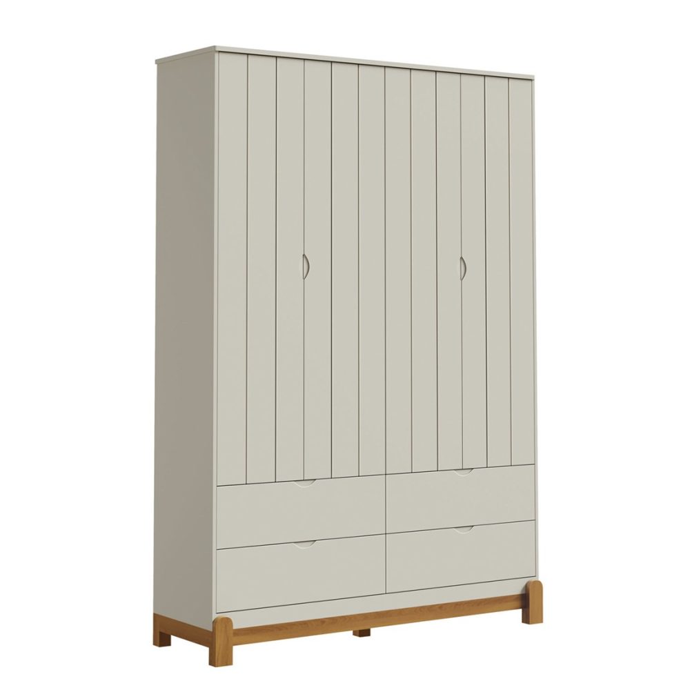 O Roupeiro Lótus, combina design moderno, funcionalidade e acabamento impecável. Produzido em 100% MDF, possui 4 gavetas amplas com corrediças telescópicas, garantindo abertura suave e total, além de puxadores embutidos e acabamento sem parafusos aparentes, que valorizam o visual clean do móvel. As portas com frisos trazem sofisticação ao design e contam com dobradiças com sistema Slow Motion, proporcionando fechamento silencioso e delicado. Sua ótima divisão interna facilita a organização das roupas e acessórios do bebê, enquanto os pés em madeira adicionam charme e aconchego ao ambiente.