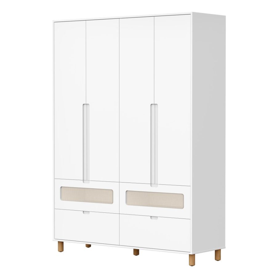 O Roupeiro Ollie 4 Portas é fabricado em 100% MDF, garantindo resistência e excelente acabamento. Possui 4 portas com puxadores embutidos e dobradiças com sistema Slow Motion. Conta com cabideiro metálico para melhor organização das roupas, 4 gavetas com corrediças telescópicas que permitem abertura suave e total, detalhe em tela tipo rattan natural, aplicado na parte frontal, que proporciona ventilação e um toque artesanal ao móvel e os pés em madeira pinus, que adicionam charme e estabilidade ao móvel.