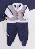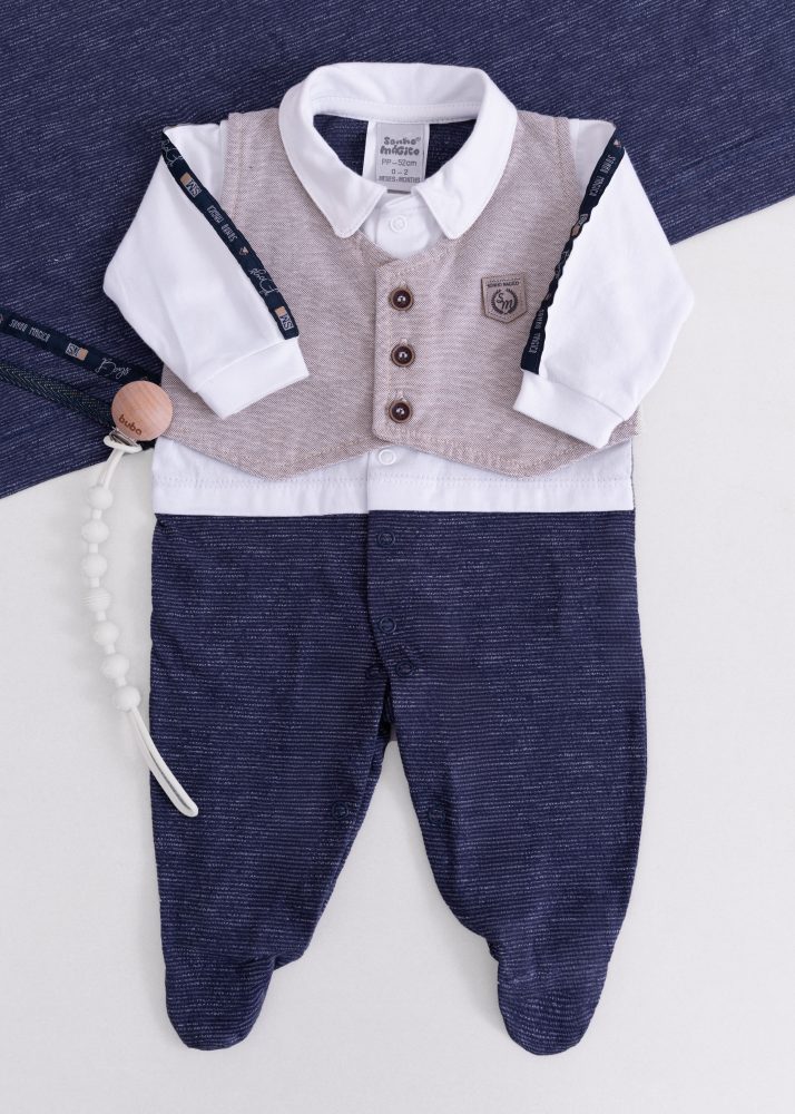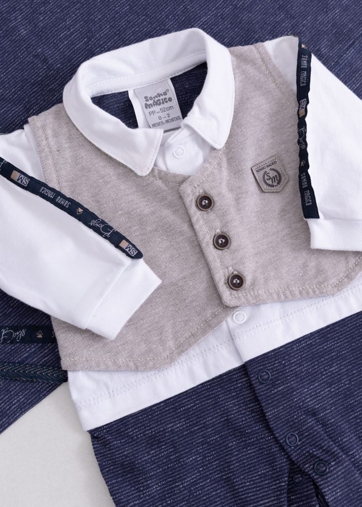 Macacão elegante e confortável, confeccionado em malha macia, com sobreposição de colete e botões decorativos que valorizam ainda mais a peça. As mangas contam com detalhes aplicados, possui fechamento por botões em toda a parte frontal e entrepernas, facilitando na hora de vestir o bebê e conta com pezinho fechado, garantindo conforto e mantendo o bebê aquecido.