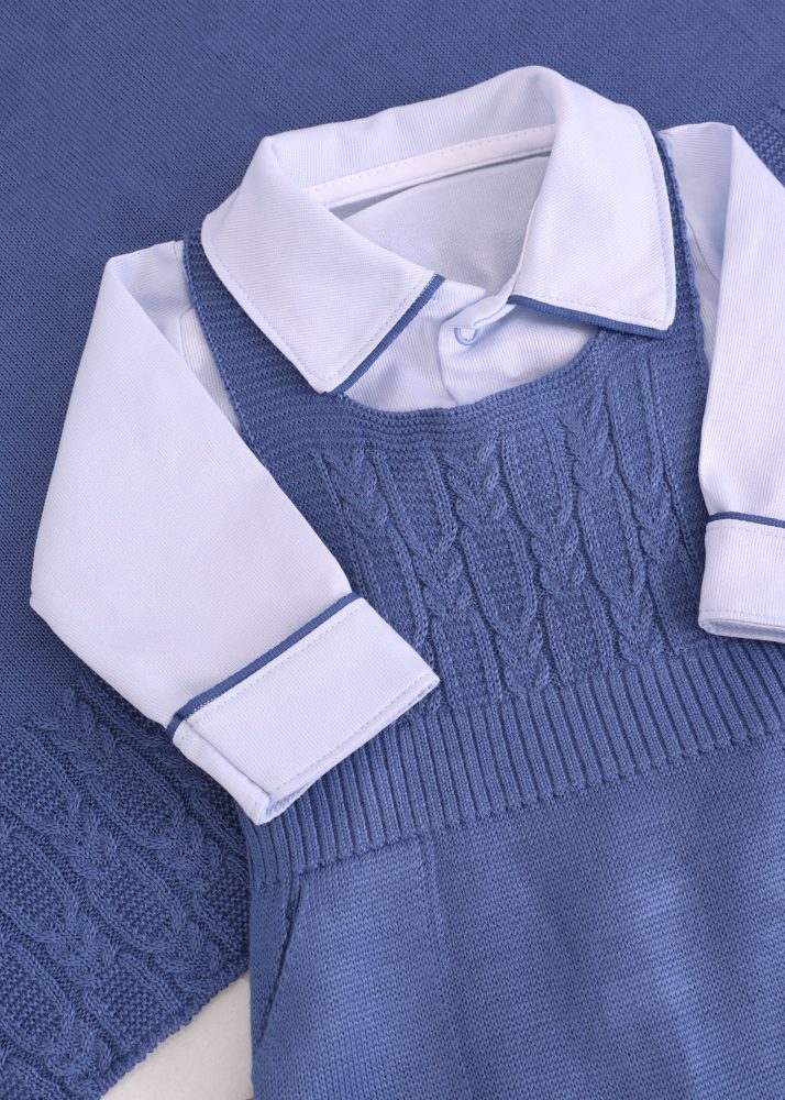 O conjunto conta com jardineira em tricô com textura trabalhada, trazendo charme e acabamento impecável. Possui alças cruzadas nas costas com regulagem, garantindo melhor ajuste ao corpo do bebê. Conta também com abertura entrepernas por botões de pressão, proporcionando praticidade e facilidade nas trocas.