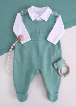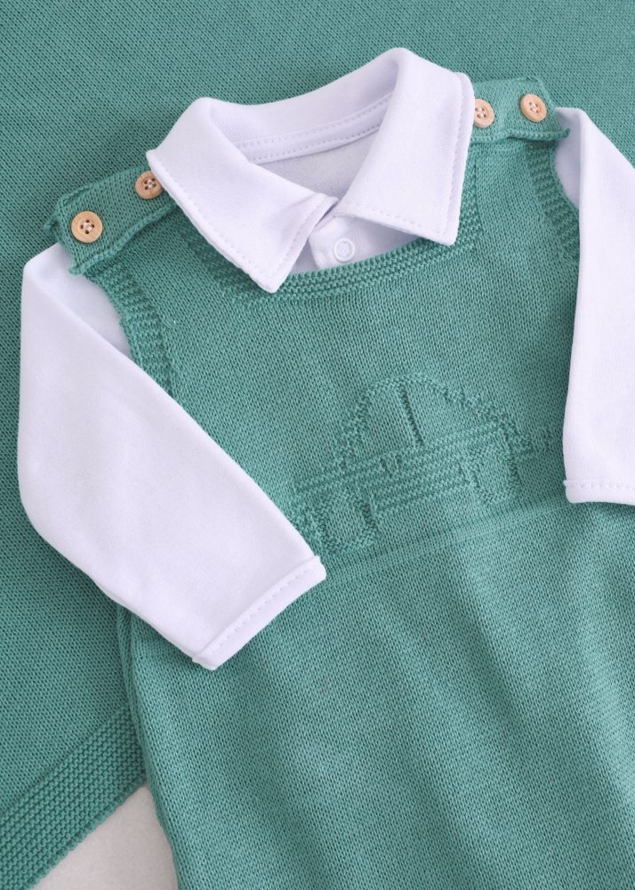 O conjunto conta com jardineira em tricô macio, com alças e botões amadeirados, que trazem um toque delicado. Na parte frontal, possui desenho de carrinho em tricô, deixando a peça ainda mais especial e temática. Conta também com abertura entrepernas por botões de pressão, garantindo praticidade nas trocas, e pezinho fechado, mantendo o bebê aquecido e confortável.