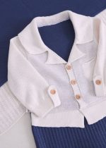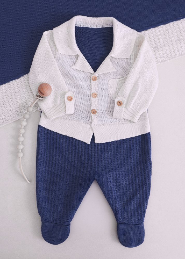 O conjunto conta com macacão em tricô todo trabalhado, com textura rica em detalhes que trazem sofisticação e acabamento impecável. Possui gola clássica, que deixa o visual ainda mais refinado, e botões amadeirados funcionais na parte frontal. Conta também com abertura entrepernas por botões de pressão, garantindo praticidade e facilidade nas trocas do recém-nascido.