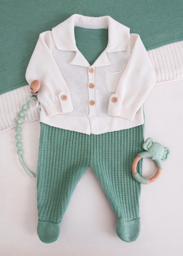 O conjunto conta com macacão em tricô todo trabalhado, com textura rica em detalhes que trazem sofisticação e acabamento impecável. Possui gola clássica, que deixa o visual ainda mais refinado, e botões amadeirados funcionais na parte frontal. Conta também com abertura entrepernas por botões de pressão, garantindo praticidade e facilidade nas trocas do recém-nascido.