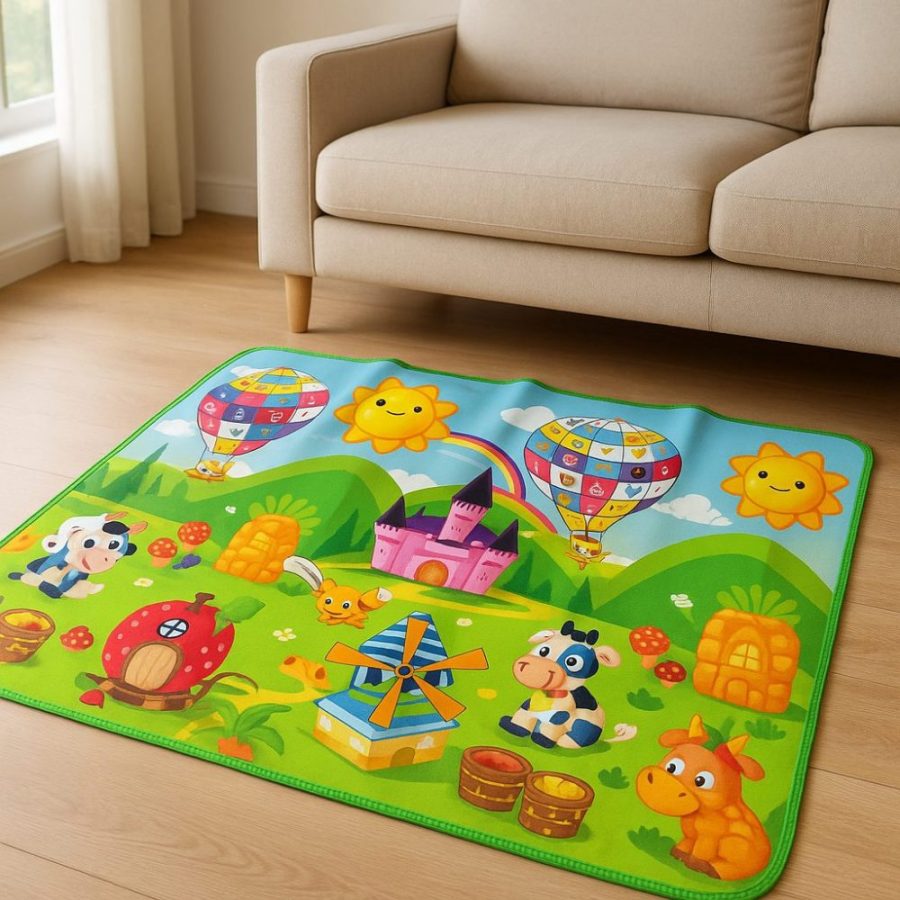 Com dimensões de 90x120cm, o tapete é perfeito para quartos, salas de brinquedos, espaços de leitura ou qualquer área onde os pequenos possam explorar com segurança. A estampa divertida de fazendinha desperta a curiosidade e imaginação, tornando o ambiente mais lúdico e estimulante.
