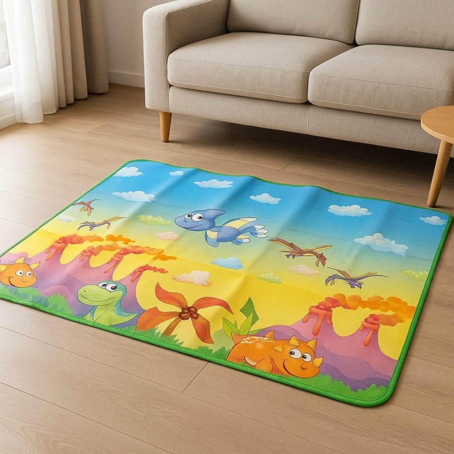 Com dimensões de 90x120cm, o tapete é perfeito para quartos, salas de brinquedos, espaços de leitura ou qualquer área onde os pequenos possam explorar com segurança. A estampa divertida de dinossauros desperta a curiosidade e imaginação, tornando o ambiente mais lúdico e estimulante.
