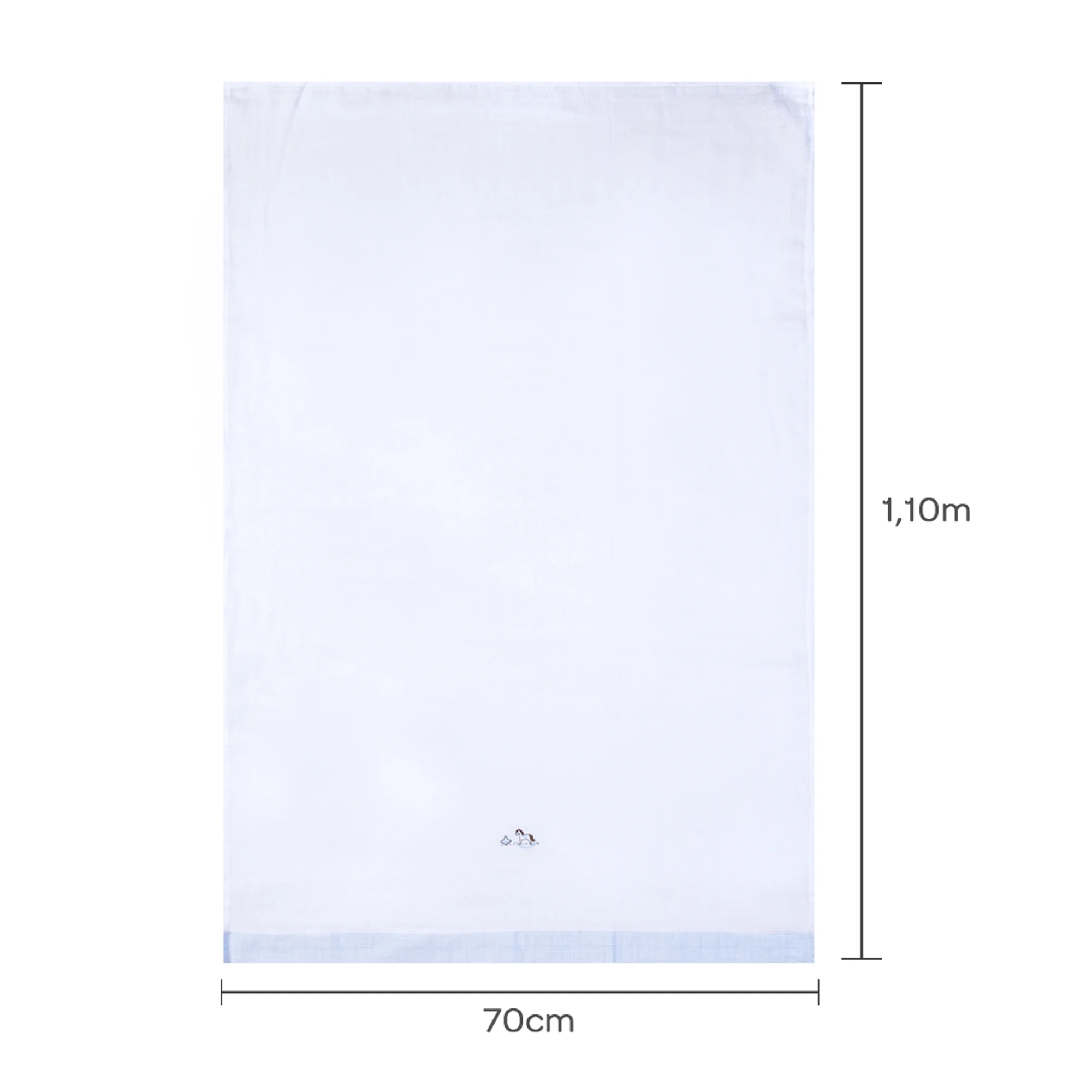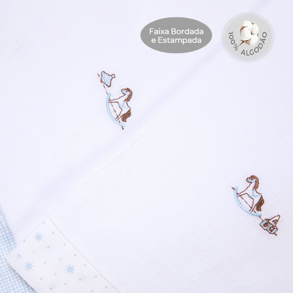 A Toalha de Fralda Papi é confeccionada em 100% algodão, garantindo toque macio, alta absorção e conforto para a pele delicada do bebê. Possui faixa estampada e bordados com cavalo de madeira, trazendo um charme especial ao enxoval.