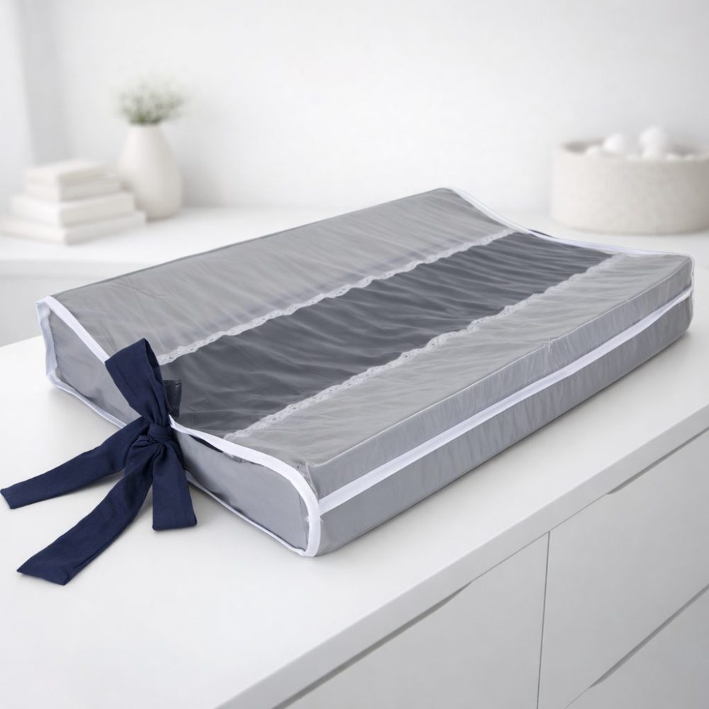 O destaque fica por conta do detalhe central em linho com acabamento delicado em renda e laço lateral, que traz charme e sofisticação ao enxoval. Seu design foi pensado para encaixar perfeitamente sobre a cômoda, garantindo praticidade no dia a dia e um visual harmonioso no quarto do bebê.