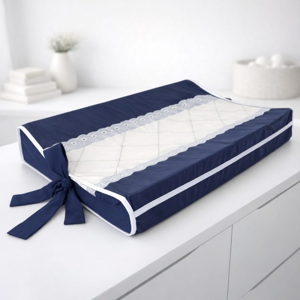 O destaque fica por conta do detalhe central em linho com acabamento delicado em renda e laço lateral, que traz charme e sofisticação ao enxoval. Seu design foi pensado para encaixar perfeitamente sobre a cômoda, garantindo praticidade no dia a dia e um visual harmonioso no quarto do bebê.