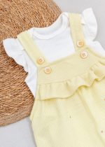 Acompanha body off white básico, com manguinhas franzidas e malha macia, garantindo conforto o dia todo. A gola envelope facilita vestir a bebê, e os botões de pressão no entrepernas tornam as trocas muito mais práticas.