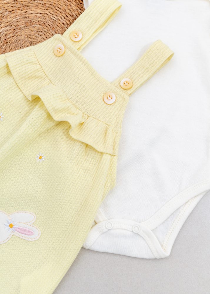 O vestidinho salopete amarelo coelhinho é pura delicadeza! Feito em tecido texturizado leve e confortável, o modelo possui estampa bordada de margaridas e um coelhinho super fofo na barra, trazendo um charme especial à peça. As alcinhas têm botões para regulagem e babadinho frontal deixando o visual ainda mais delicado.